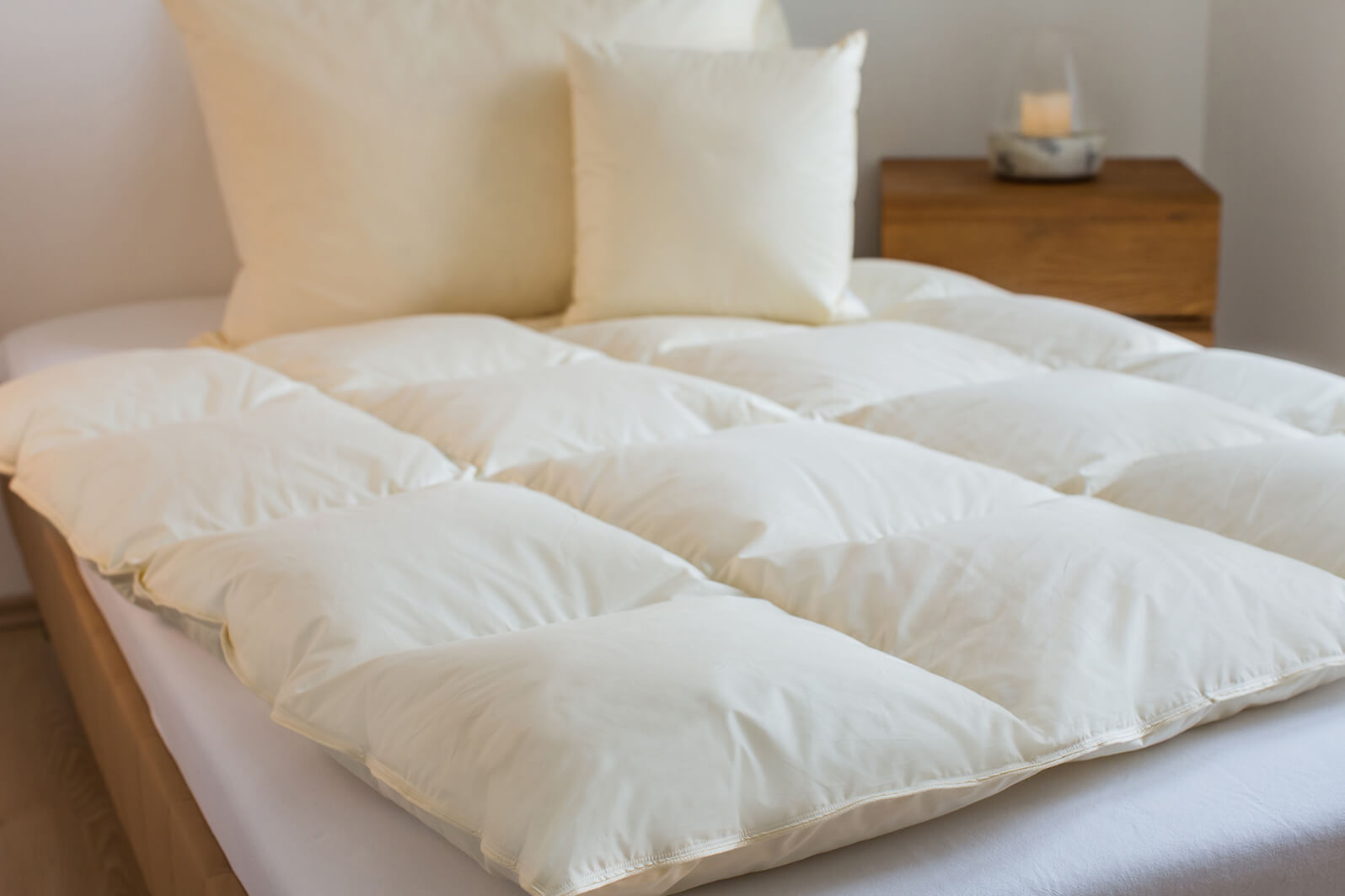 Unsere handgefertigten Daunenbetten sind atmungsaktiv, feuchtigkeitsregulierend und temperaturausgleichend.